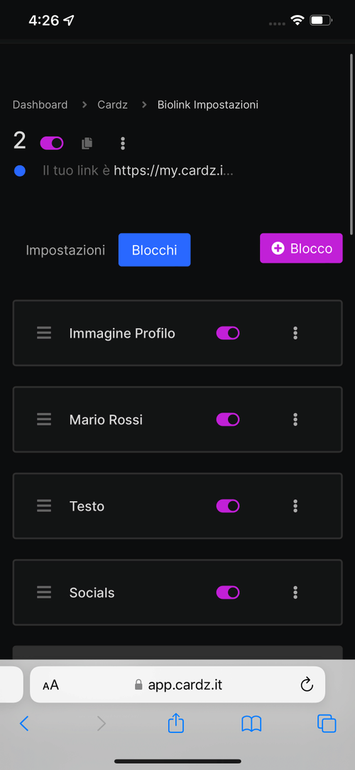 Quindi ti confermo al 100% che potrai utilizzare senza limiti la tua landing page che grazie alla dashboard avanzata di app.cardz, potrai gestire e allestire secondo ogni necessità sia organizzativa che grafica.